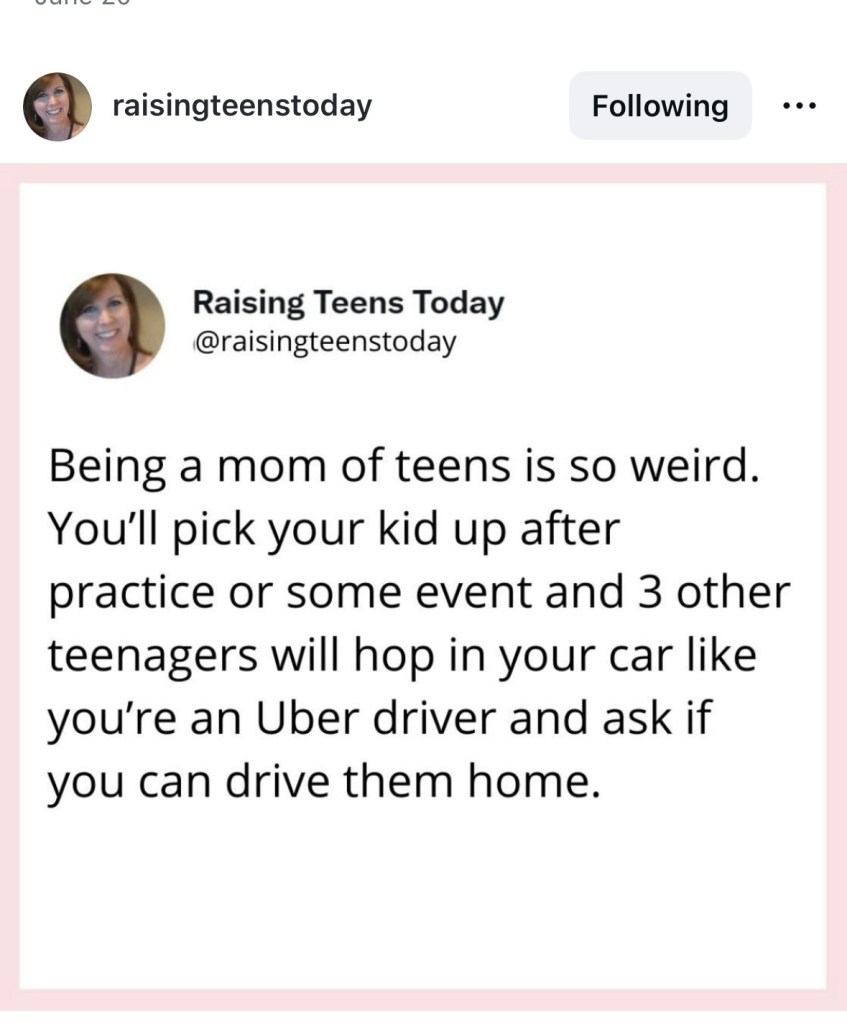 Ok, this made me chuckle, but I can also relate. How do I have two kids driving me around town?! (BTW – I’m still getting used to this milestone!)