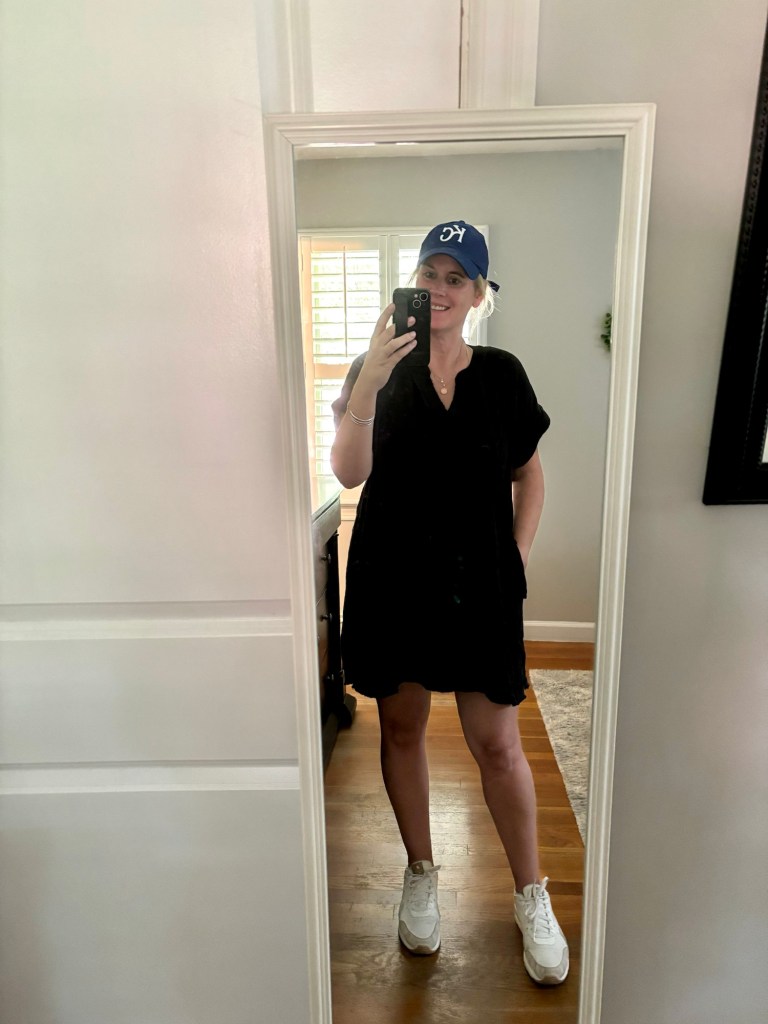 Saturday morning, I was in my pjs until 11:00, and then I worked out. After that, I showered and put on this flowy guazy dress, my Air Maxes and a KC hat for our time in Cinci at Top Golf and the KC/Reds game.