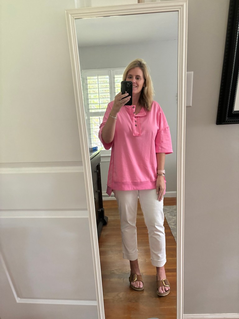 On Monday, we were to wear pink to school, and I wore one of my fave Amazon shirts, with white jeans and my Birks.
