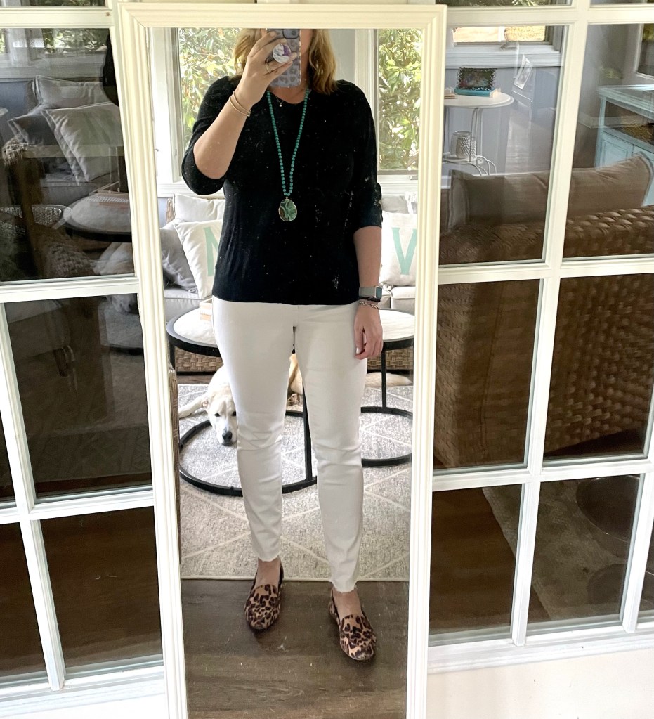 A black sweater, white jeans, and leopard flats provide a perfect outfit for work.