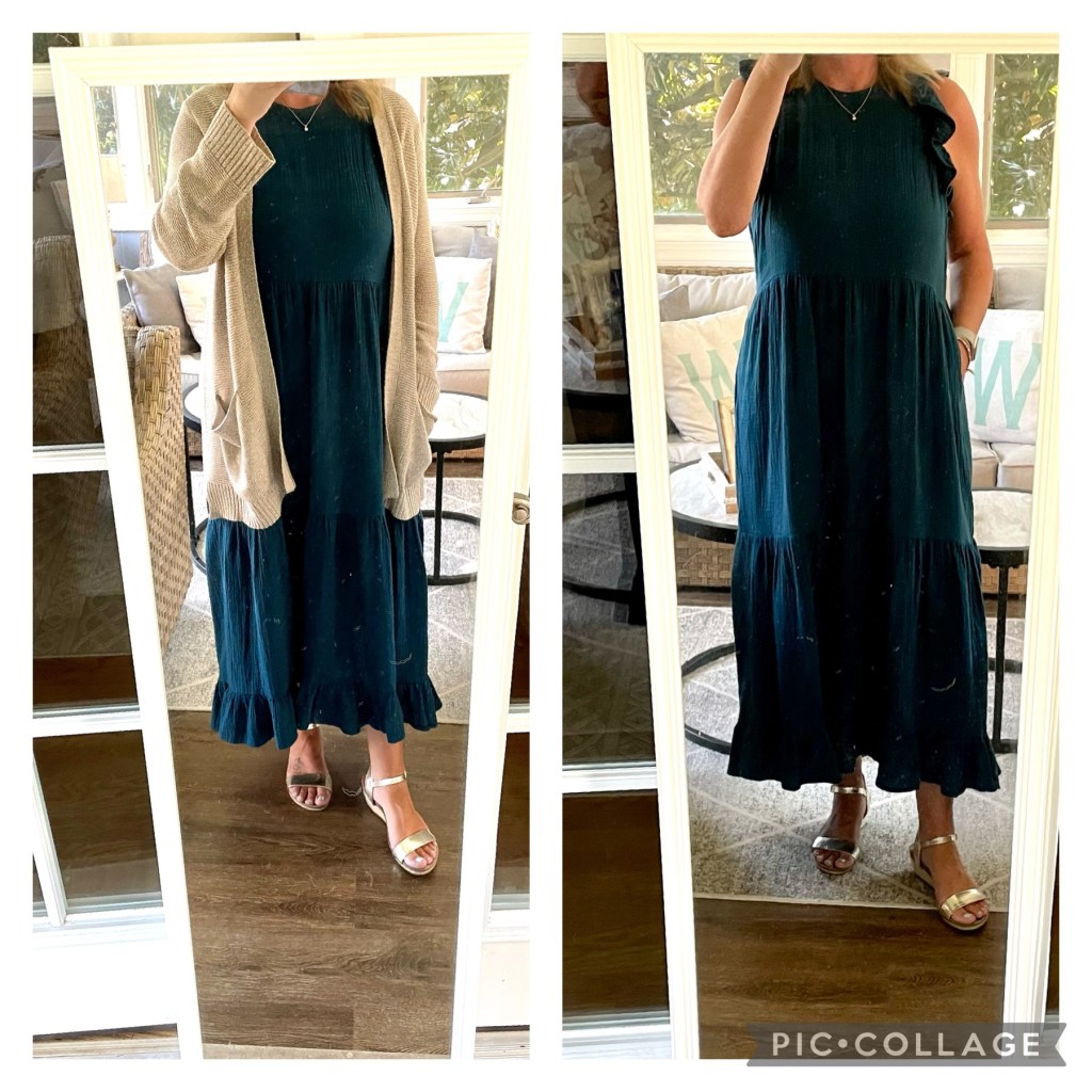 Of everything I’ve purchased recently, this dress was my only “impulse” buy. I thought it looked like a dress that could be dressed up or down…or even used as a cover up. It’s light, flowy, and perfect for summer. I sized way down to a small.