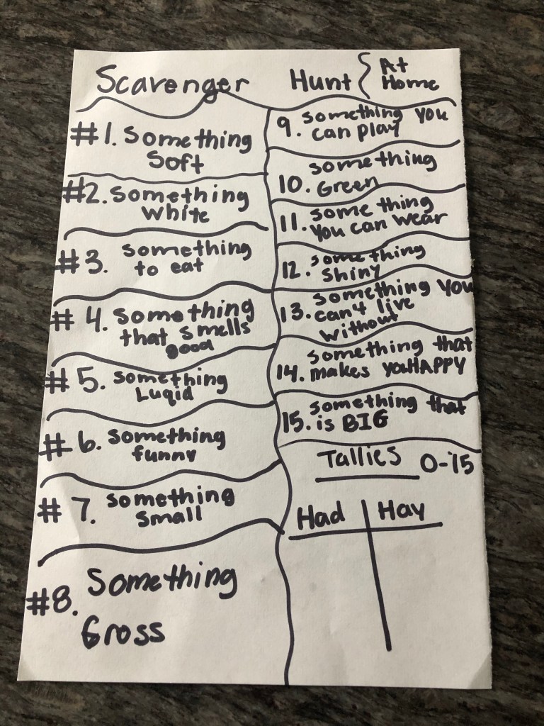 Hadley actually had the idea for an indoor scavenger hunt. I started to look on Pinterest, but she put one together herself based off some that she had seen.