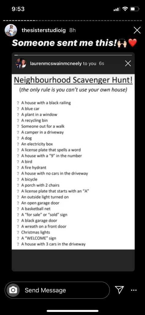 After that activity, I thought it would be fun to do a (non-competitive) outdoor scavenger hunt. Again Pinterest has lots of ideas, but that evening I so happened to see Jen Reed post this (a re-share) on Insta Stories.