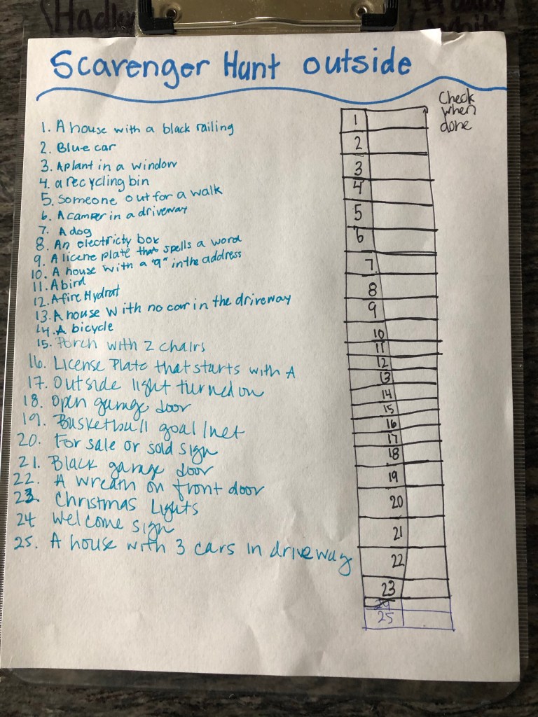 Hadley started to write it out, and I helped her finish the list up. We wanted to put it on a clipboard as we walked through the neighborhood. So, last week the kids and I took about thirty minutes to just walk through the neighborhood and see what we could find. We found most everything—even Christmas lights. We never found a license plate that spelled a word or a camper in the driveway. We had fun and got fresh air at the same time.