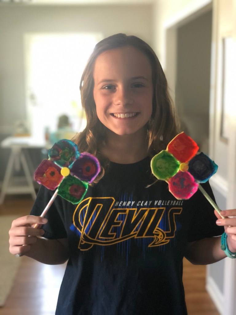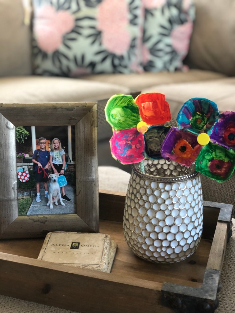 I just used good scissors to cut the bottom of the carton into three flowers. Then I snipped around the edges and cut in the “V” for each flower to make the “petals” better. Then, Hadley and I each painted a flower. I have cute straws in a jar on our kitchen table, so we each grabbed one and I taped them on the flowers for the stem.