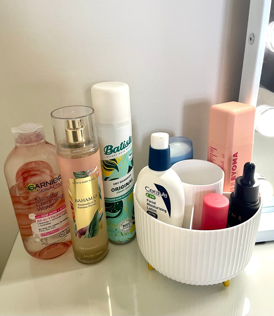 I bought this organizer about a year ago, and it’s still working perfectly to house my skincare. I keep my makeup in this toiletry bag, and I also use it for travel.