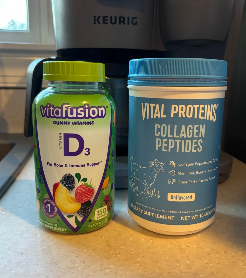 Through the years, I’ve taken vitamins and added collagen to my coffee, but for whatever reason I’m not always the best about re-ordering when I run out. Right now, I’m two for two taking my daily Vitamin D and putting a scoop of collagen in my coffee every morning.