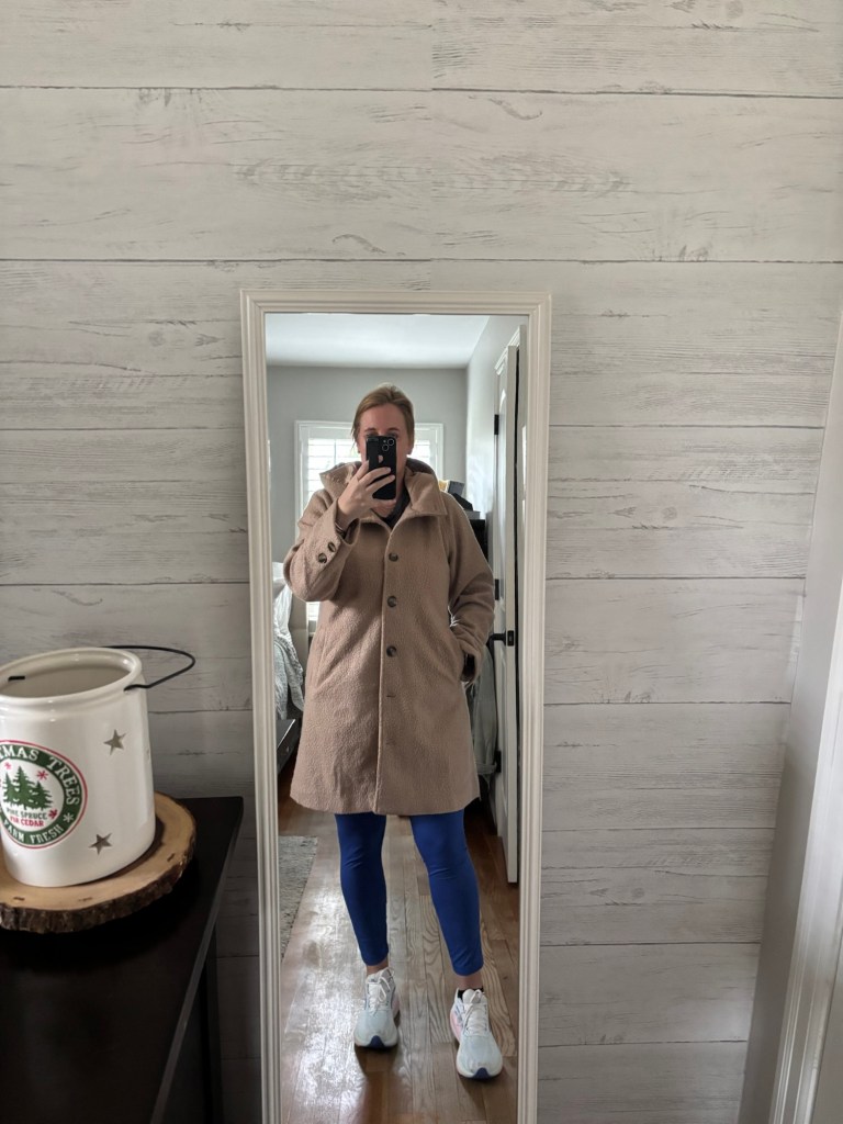 I had some Amazon gift cards, so I purchased this coat, and I love it. It’s wool, and I love that it has a hood and deep pockets.