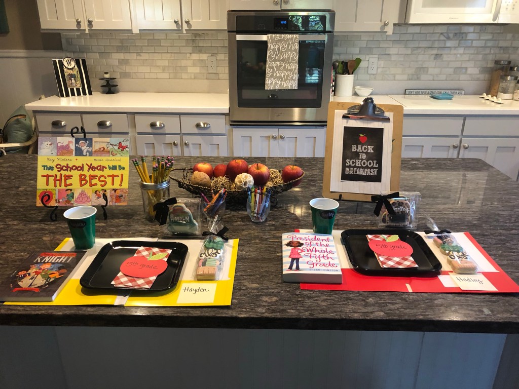 The black plates, book, napkins and paper apples all came from Amazon. Honestly, it was a 20 pack of napkins, but I use the same folded one every year. The apples came in a pack as well, and I just use a new one each year and write their new grade level on it. I think this is the second year I’ve use the folder as a placemat with the same sticky note with their name on it. The placemat idea came from the Momfessionals blog. Lastly, I’m always surprised with what books I find on Amazon after searching for whatever grade the kids are starting. Thankfully, both my kids like to read, so it’s a way to keep them reading and give them something to start the year.