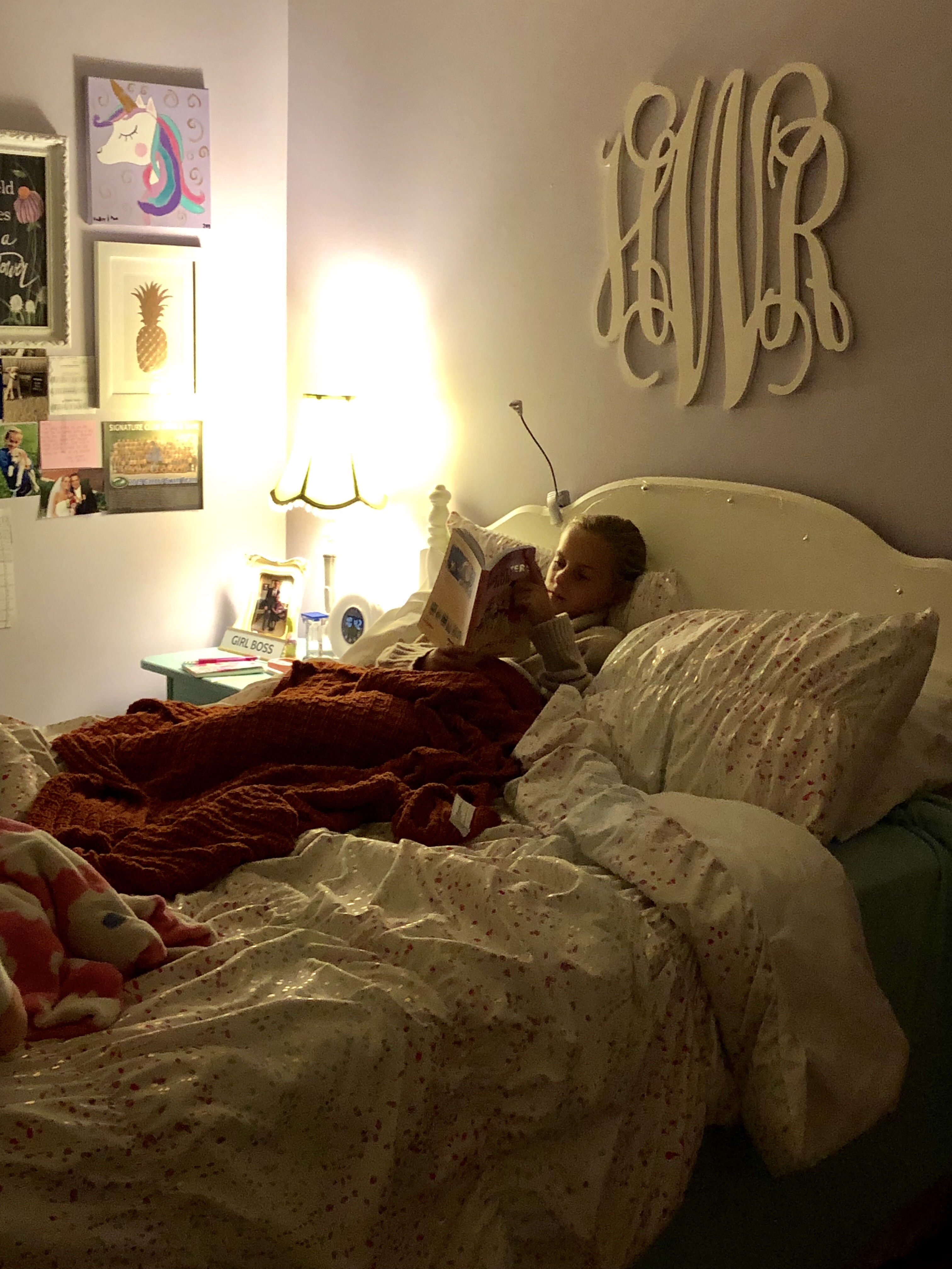 After movie night on Friday, followed by a late dinner and even later bedtime, I peeked into Hadley’s room and found her reading her newest Babysitters Club book, Boy Crazy Stacey that she bought at the book fair. Some of the BSC books have now been turned into graphic novels which has been perfect for Hadley. My two proudest accomplishments with my kids are the fact that they are generally kind and that they love to read. #myworkhereisdone right?!
