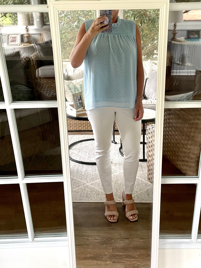 - This sleeveless top is great with jeans, white denim or shorts! It has a sheer lining, but I added a tan cami under it to be on the safe side. It ties in the back which is cute.