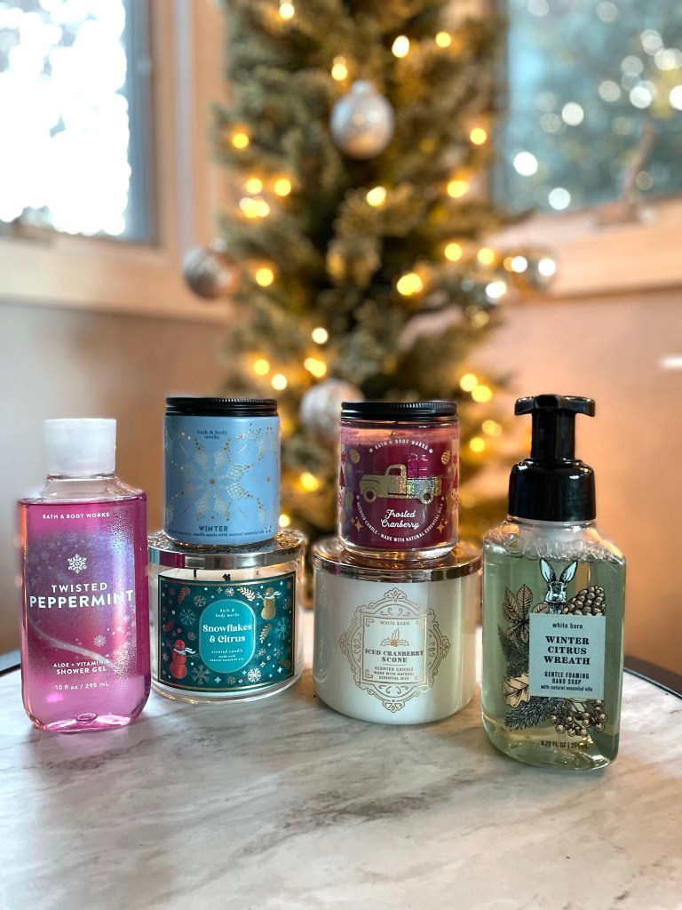 Winter Citrus Wreath hand soap is perfect for the kitchen, and Twisted Peppermint is a favorite shower gel this time of the year.