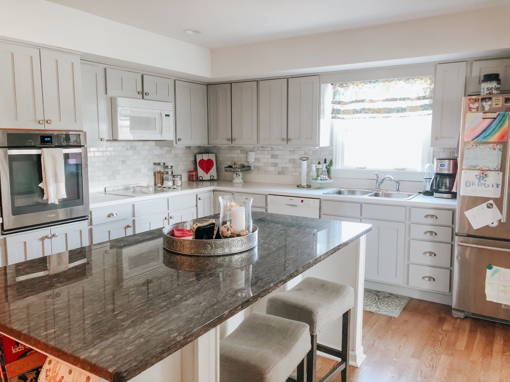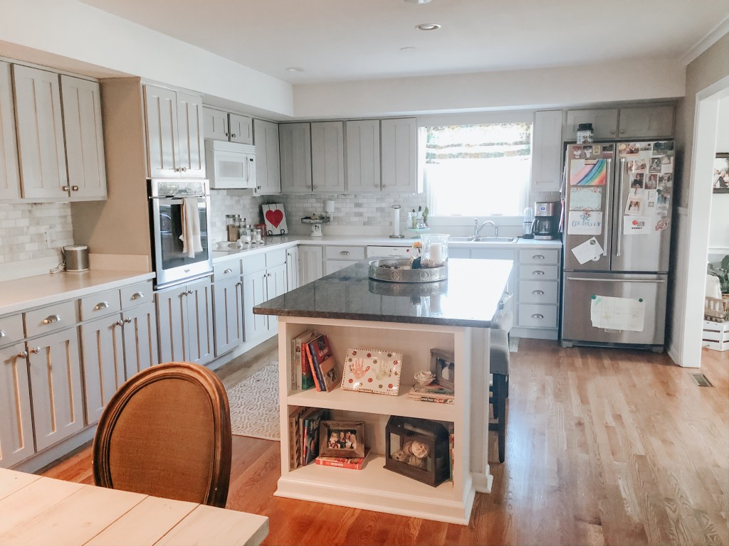 The island with built in shelves was always a dream of mine. I loved picking out the granite (sticking with my color scheme of gray!), and the kids eat breakfast at the island every morning. We don’t have a pantry, but we do have tons of cabinet space, so we are lucky in that regard. The oven was the first appliance we swapped out…but only after it went kaput after living here about a year. Then, we needed more room in the fridge, so we purchased that next after about two years. The dishwasher and microwave are high quality, so we’ve left them as is for now, but will probably get new ones at some point. I also dream of a new sink and gas stove. I’m hoping to cross those things off the list sometime in the near future.