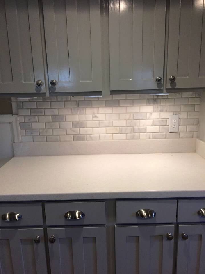 I think about six months after we got the cabinets painted, we had the back splash updated. Our neighbor installed it for us and was tedious with choosing tiles that would be a good combo of colors. Not too many white tiles vs. too many gray tiles! Balance.