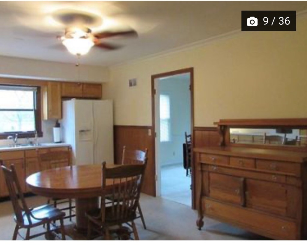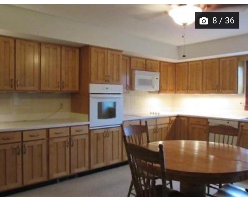 The kitchen is big and the cabinets are great quality. Also, the counter tops were a light colored Corian material, and we were pleased with them. What were we not so pleased with? Uh…the carpet in the kitchen! To be fair, the carpet was immaculate. An older couple had lived in the house before us…but carpet with four-year-old twins was not a good combo upon moving in! I also didn’t love the fact there was a ceiling fan so close to where I’d be cooking. We actually moved the ceiling fan to our living room! Win win.