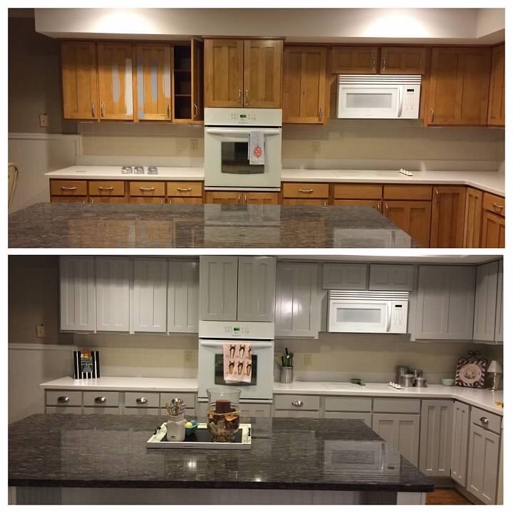 I like to make things as pretty as possible as soon as possible. One thing I was very proud of is that we lived in the house awhile before making some decisions. We’d lived in our house about a year before we decided to paint the cabinets. I debated between a gray or white for the cabinets. At the time, the back splash was an off white tile. While I knew we’d change it at some point, I just didn’t know when. Also, with the white paneling, I was afraid the whites wouldn’t match or it would be too much white. So, we went with a gray color. After much debate, (why are grays so difficult?!), we chose Sherwin Williams Light French Gray.