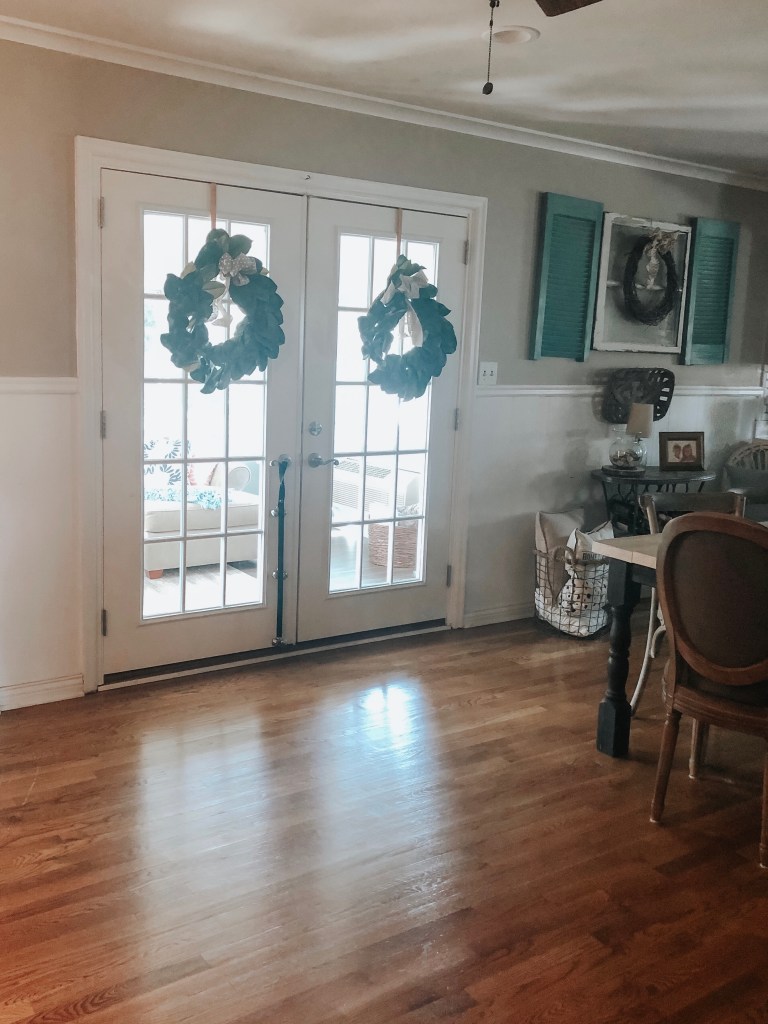 There was a heavy sliding glass door that leads out to the sun room. Another one of the first changes we made was getting French doors which made a pretty dramatic difference for this area of the house