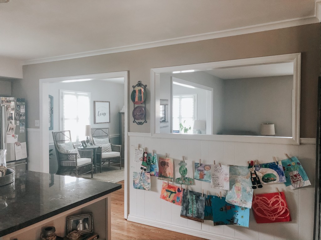 Travis painted the paneling white as a quick fix. Then, he used Pavilion Beige on the walls which is what we painted our walls in our former house before putting it up for sale. Also, there’s the cut out that looks into the living room.