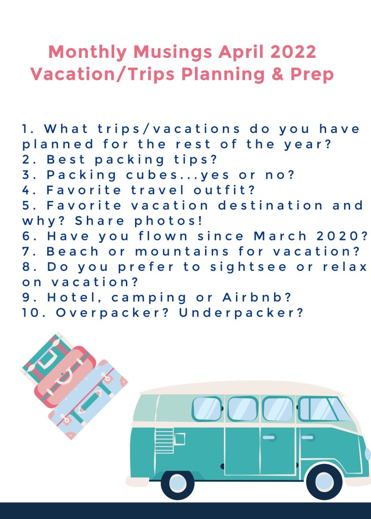 Leading up to a trip, I start a note on my phone of the random things I want to remember: book, Kindle, charger, sound machine, Melatonin, etc. I keep meaning to create a standard packing list to have on hand when we pack, but I’ve never done it. It would be nice to have a “beach” list, “overnight one night somewhere” list, and “KC” list, etc. Maybe this summer I will get to it!