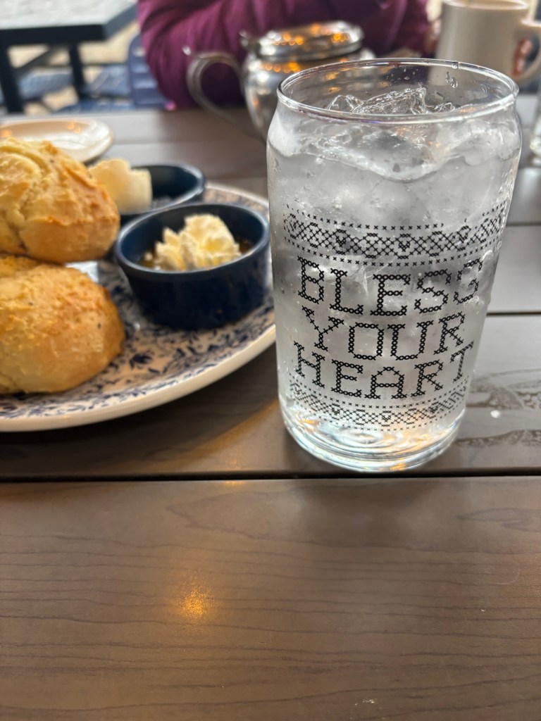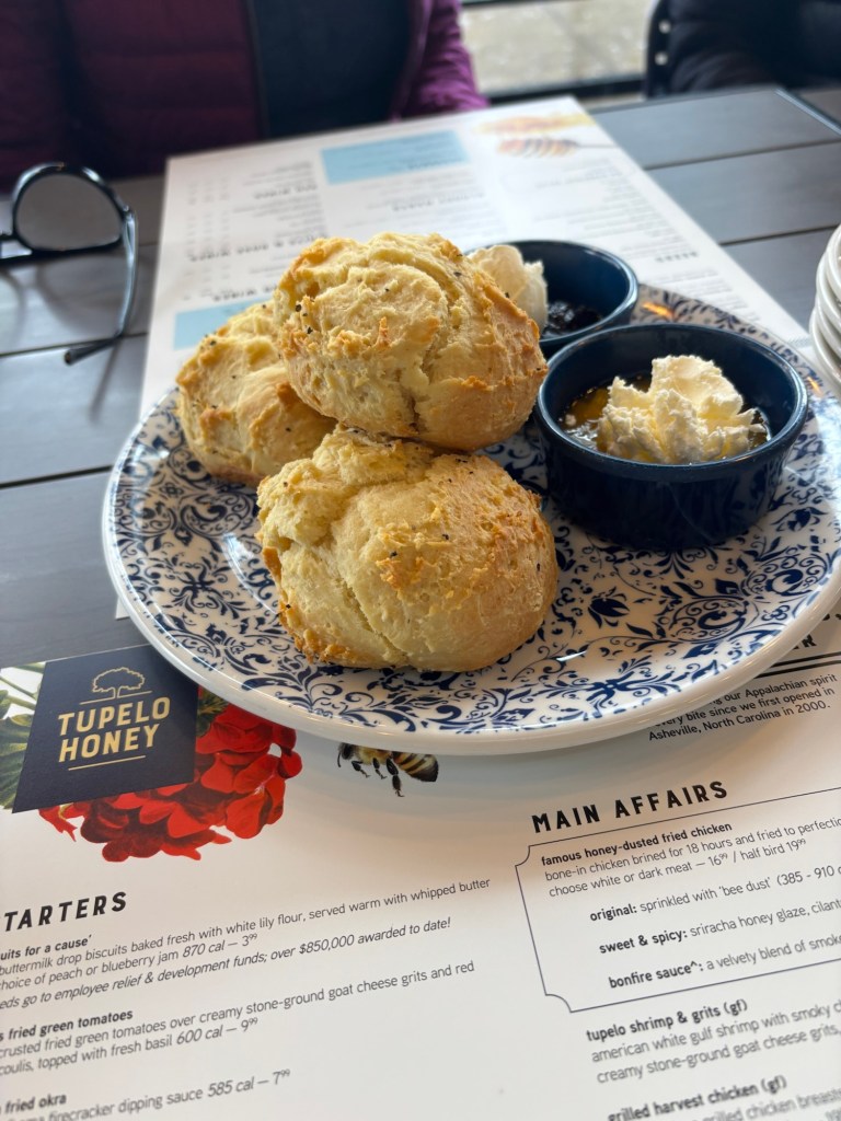 Sunday, they didn’t play until the afternoon, so we had some time on our hands. It was a really rainy morning, so it was nice to start off slowly. We met friends and had lunch at Tupelo Honey. We’d been to one in Asheville before, and the biscuits were as good as I remembered them to be.