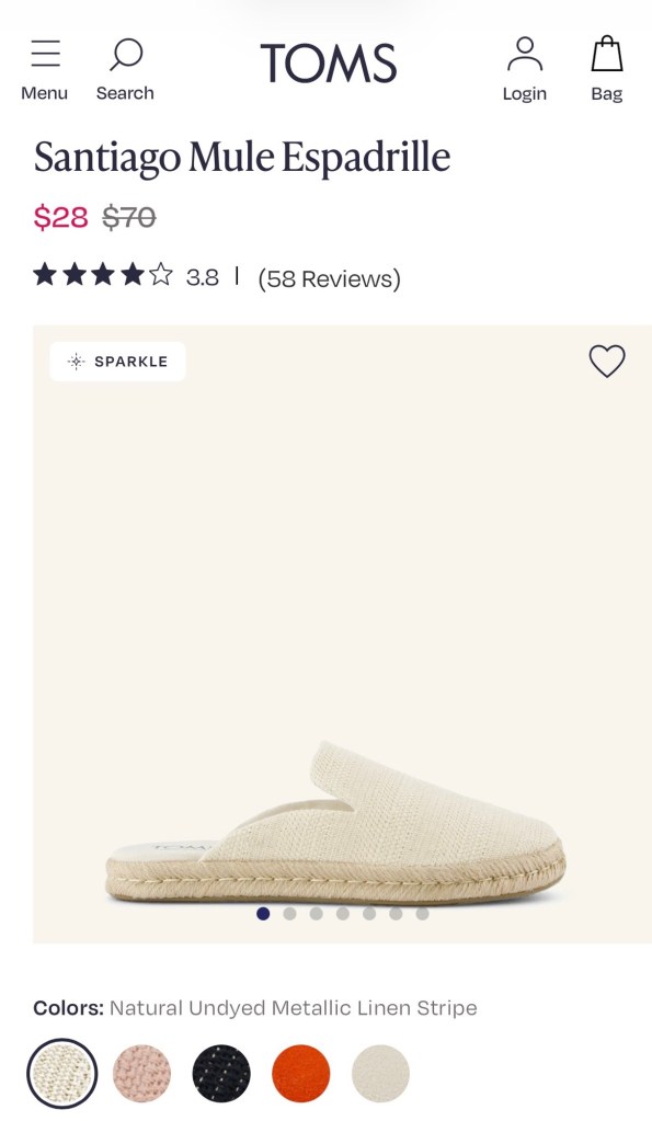 Y’all, the Toms ads are targeting me! In the winter, I purchased two pairs of booties (to replace two that I’d had for years) that were on sale, and then, I saw an ad for these mules that were on sale. I ordered the metallic linen color, and they arrived this week. I can’t wait for spring! (Some colors appear to be out of stock, but there is limited sizing on some others…I did size up from a 9 to 9.5)