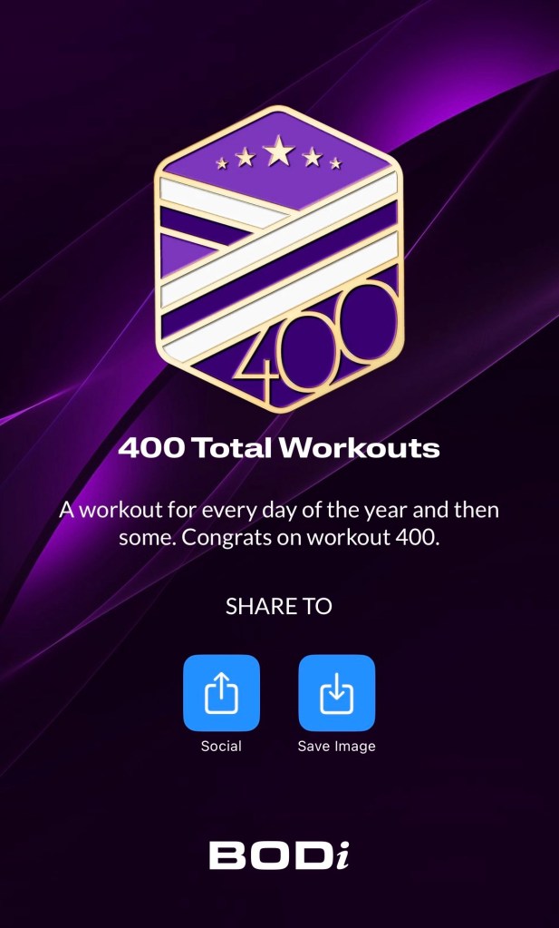 Yesterday, I didn’t feel like working out, but I decided to do a quick workout. Well, I got a notification that I’d completed my 400th workout! I believe this is my 400th since I started tracking about three years ago. Anyway, it was a pleasant surprise of an accomplishment.